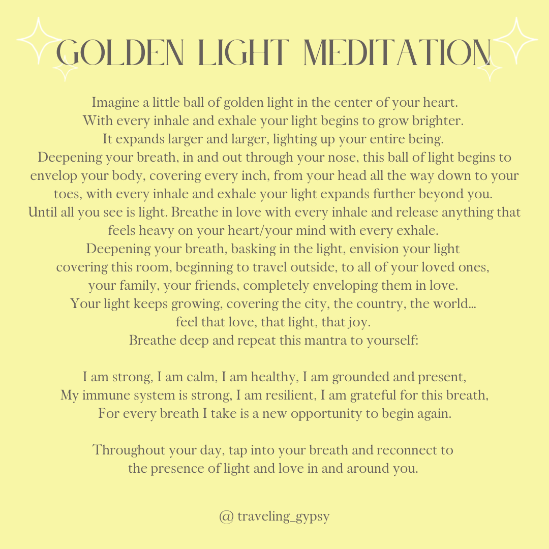 This meditation is to help you tap into your breath and reconnect to the presence of light and love in and around you. Breathe in love with every inhale and release anything that feels heavy on your heart/your mind with every exhale.